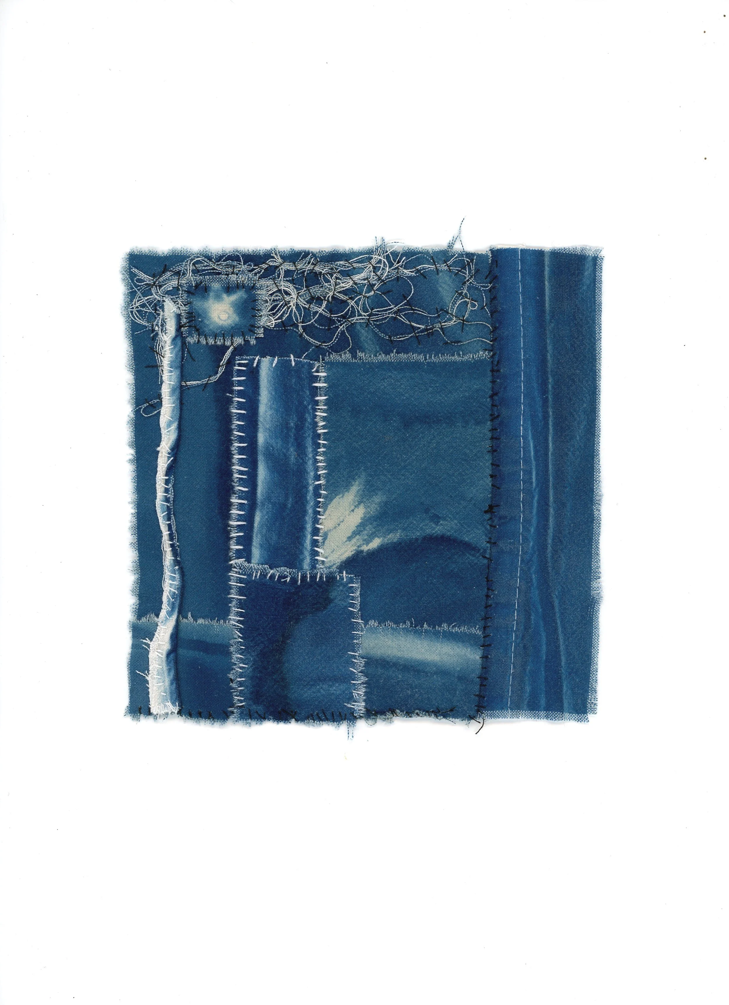 So as the sun went down, I pulled out the cyanotype bed sheet I made as a table cloth for art markets. I hadn’t had the space to work on it all at once, so had exposed pieces of it at a time. This created a messy, but not in a good way, look. I decided to tear it up, looking for impressions, marks and layers of chemistry that could be put to use in my next endeavour. I sat on the floor of my room, YouTube on in the background and got to work tearing, arranging, rearranging, documenting and then finally, sewing together.